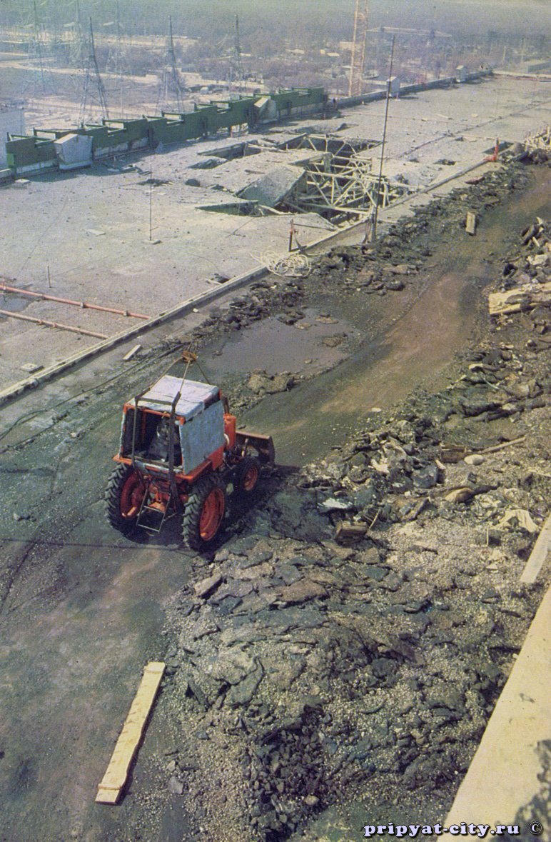 بعد انفجار المفاعل؛ الآلاف من قطع الجرافيت انتشرت من الوحدة الرابعة الى أسطح الوحده الثالثة والرابعة. وجب عليهم التخلص منها، ولكن كمية الإشعاعات التي كانت فوق الأسطح الضعيفة -التي لا تتحمل وزن الشاحنات الضخمة- أعلى بكثير من أن يتحملها الانسان.