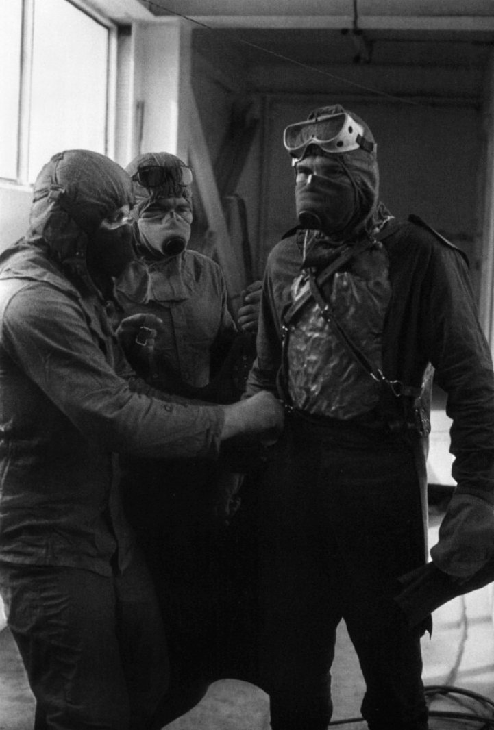 مرتدين ملابساً مخيطة يدوياً ومدرعة بالرصاص (تستعمل مره واحدة لأن الرصاص يمتص إشعاعات كثيرة وليس آمنا استعماله مرة اخرى) حمايتهم الوحيدة ضد الاشعاعات كانت فقط هذا الدرع المكون من الرصاص.