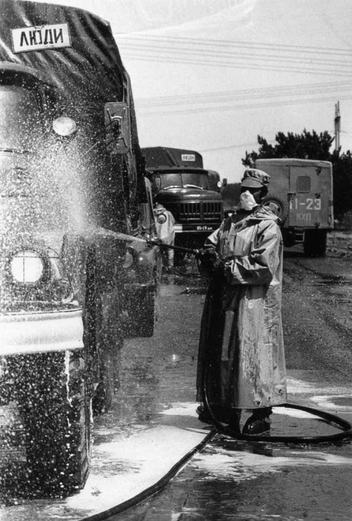 صور من عملية التطهير .. والتي اشتملت على تغيير كافة التراب المشع الموجود بالمدينة، دفن السيارات، غسل جميع الأبنية، وغيرها.