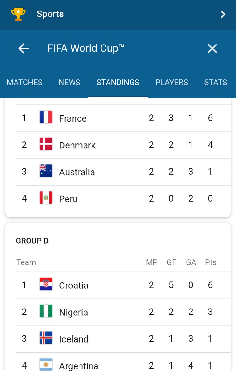 إذا استمرت نتيجة المباراتين نيجيريا والأرجنتين - أيسلندا و كرواتيا على هذا النحو .. سيتأهل كرواتيا والأرجنتين ومع الأسف تغادر نيجيريا وآيسلندا : (