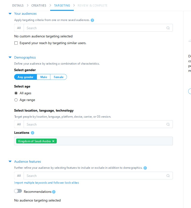 بكذا ممكن توفر مبلغ كثير اذا عرفت طريقة الوصول الى عملائك او شريحتك المستهدفه لأن كثير يستخدم الاعلان الجاهز في التويتر اللي يحدد المبلغ ويقولك ترا بيشوف اعلانك مثلاً 10ألف شخص لكل 50 دولار ، طيب ممكن يكون ال 10 ألف شخص مافيهم ولا واحد مهتم في اعلاني او منتجي ، يعني خساره