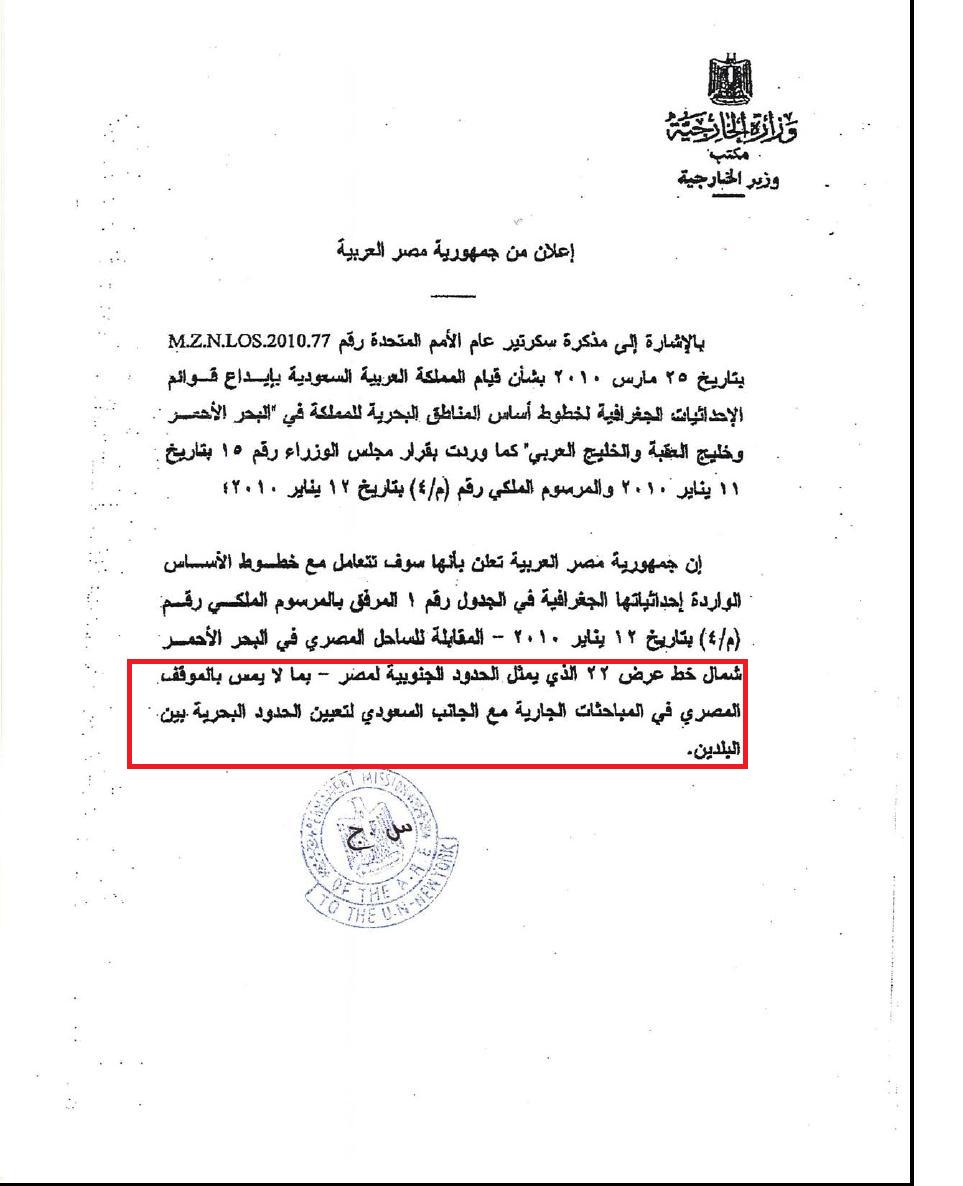 اودعت مصر سنة ٢٠١٠ رسالة بالامم المتحدة تقر بما طرحته السعودية بشكل مؤقت بخصوص حدودها البحرية وأكدت أن هذا "لن يمس المفاوضات الجارية"،