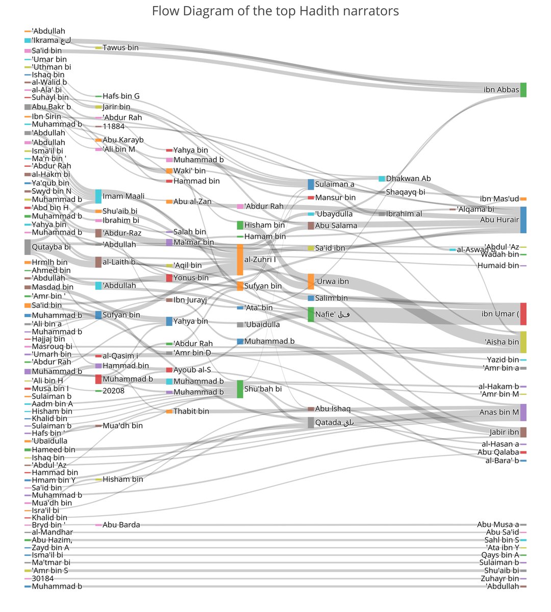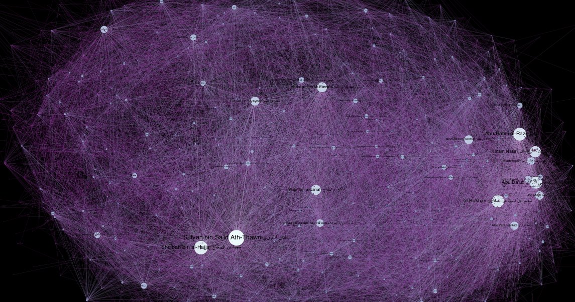 من خلال هذه البيانات تستطيع أن تعمل تحليلات شبكية تجيب عن أسئلة غير مسبوقة في العلوم الشرعية مثل توزيع رواة الحديث الجغرافي أو تحديد درجة الحديث آليا أو استخراج العلماء الأكثر بينيّة في شبكة الرواة أو حتى تحديد مصادر التحيّز في سلسلة الرواة