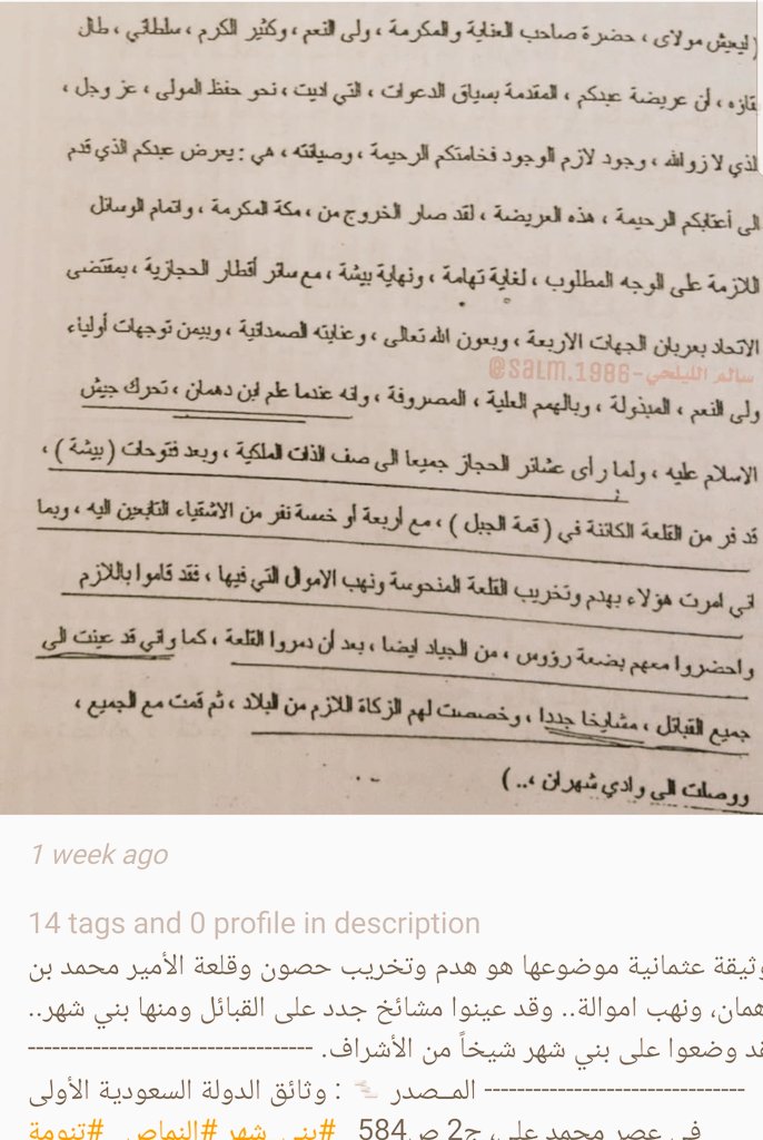 ✍٨/ كتبت أمراً إلى عبدالله بن ظافر العسبلي حاكم منطقة بني شهر قلت له فيها : يجب أن تعلم شيوخ بيشة بأن من الواجب عليهم إرسال الزكاة إلى حكومة بني شهر وأنهم إذا لم يعطوا الزكاة فإني سآتي لهم بنفسي . . .إلى آخره