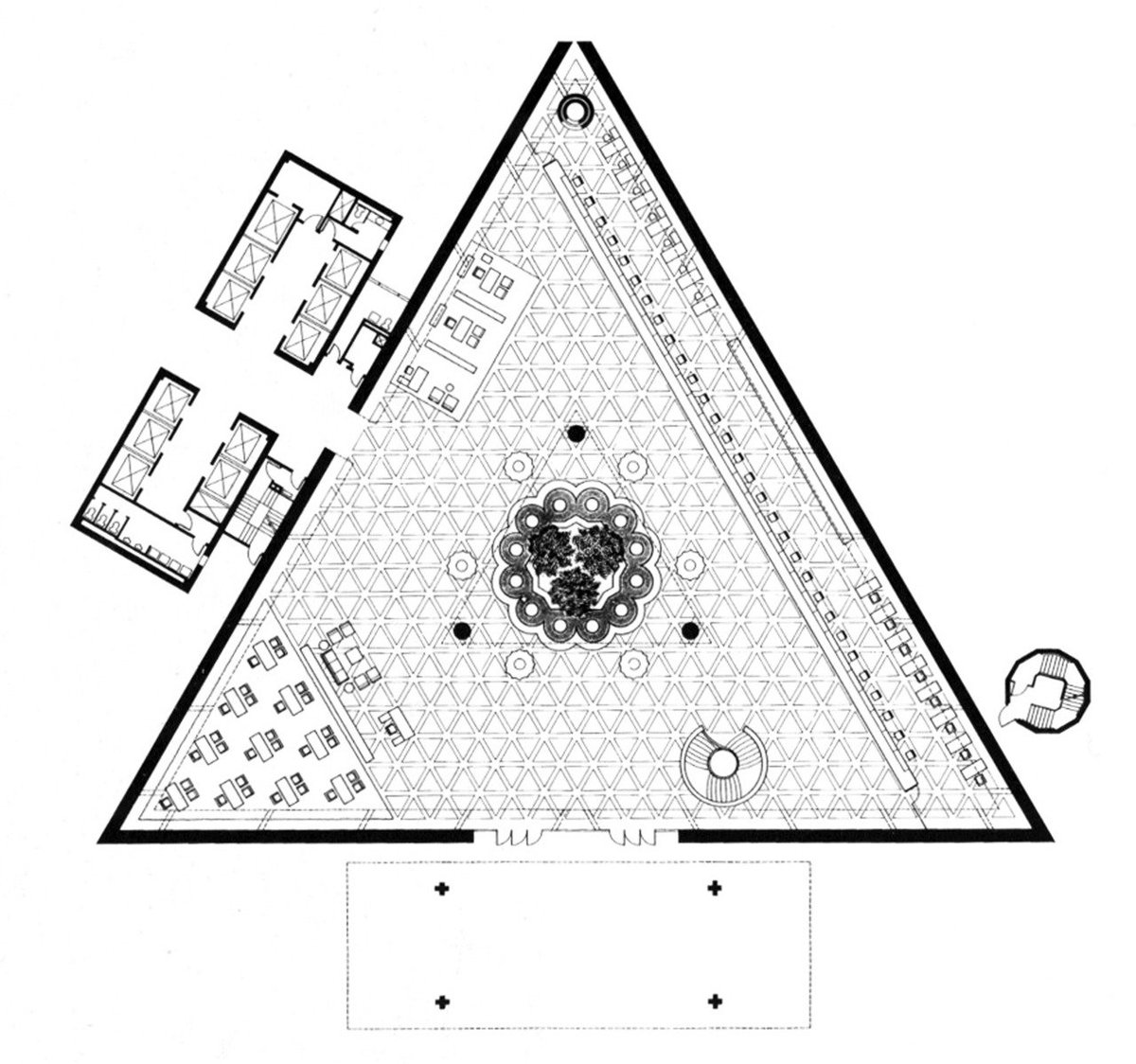 في منتصف المبنى توجد ثلاثة أعمدة سمحت للفتحات والمكاتب بالارتكاز عليها. وتم نقل وسائل الحركة الرأسية خارج المثلث. تم تصميم الفتحات الثلاث الخارجية والتي يبلغ ارتفاعها ٣٠ متر لتوفير ضوء النهار دون أشعة الشمس المباشرة.