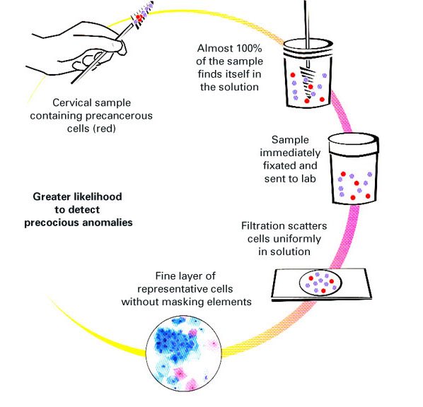 ٣-نخرج السلايد من الجهاز ونحطه في Ethanol لمدة 15 دقيقة وبعد كذا نصبغها بصبغة (Pap stain) ونسوي لها Coverslip نفس Histopathology 👌🏼٤-نحطها تحت Microscope 🔬 ونشخصها ونتحفظ فيها ف حامل السلايدات )👩🏻🔬🌸