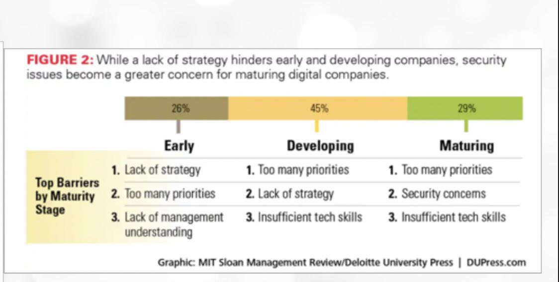 دراسة عن التحول الرقمي أجرتها MIT و Deloitte في عام ٢٠١٥م شملت أكثر من ٤٨٠٠ تنفيذي في ١٢٩ دولة وفي ٢٧ قطاع مختلف لمنشآت ذات أحجام مختلفة، كشفت الآتي: