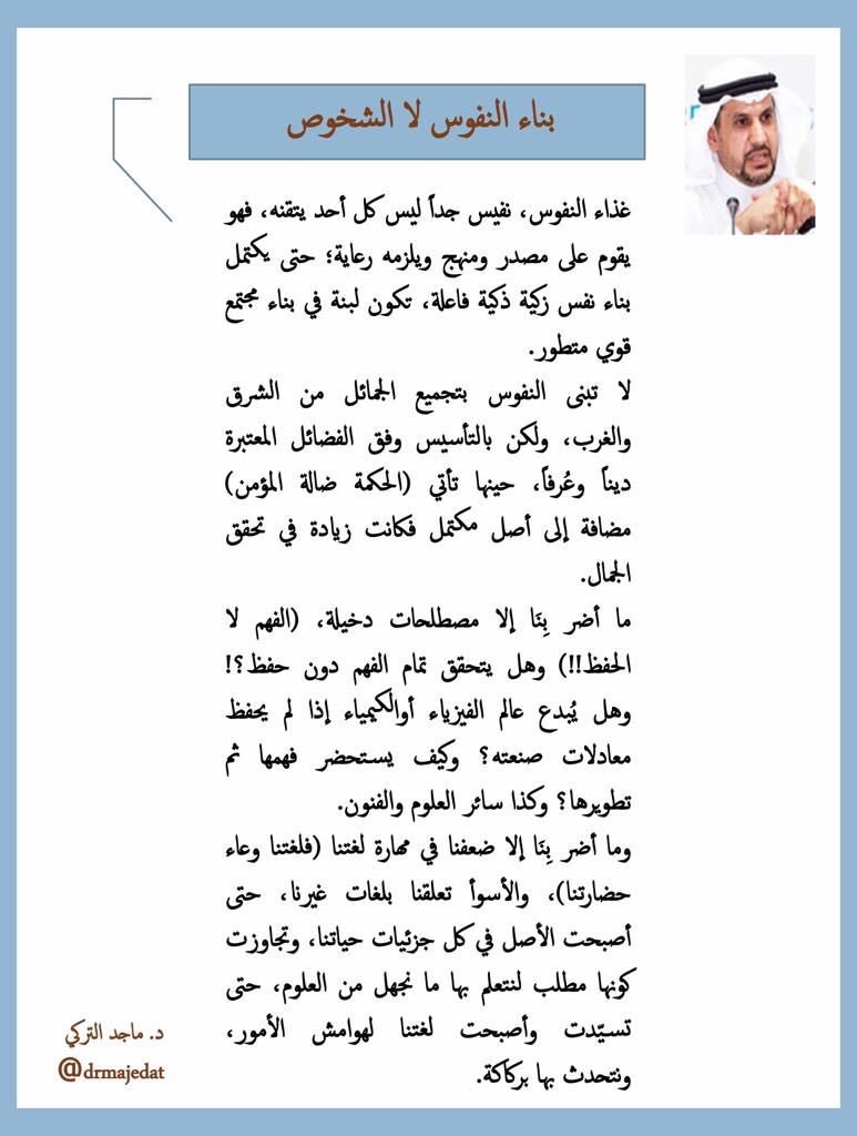 1️⃣ غذاء النفوس، نفيس جداً ليس كل أحد يتقنه، فهو يقوم على مصدر ومنهج، ويلزمه رعاية؛ حتى يكتمل بناء نفس زكية ذكية فاعلة، تكون لبنة في بناء مجتمع قوي متطور.