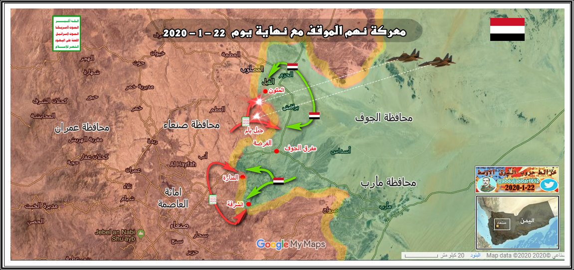 استمرار الاشتباكات في كافة جبهات نهم والقوات الحكومية تشدد من هجمهاتها على على جبهة ميسرة نهم وانباء عن استعادتها لجبل المنارة الاستراتيجي المؤدي الى جبل السفينة ونقيل بن غيلان .