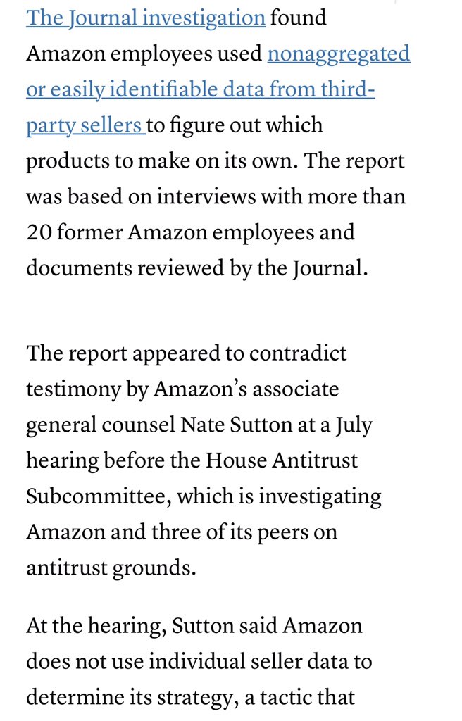 وقد هددالكونجرس جيف بيزو بإحضاره بالقوة الجبرية للمثول للتحقيق بعد ثبات كذب امازون في شهادتها امام الكونجرس، حيث تبين ان امازون تستغل بيانات البائعين من تجار وشركات يبيعون منتجاتهم عبر امازون فتقوم امازون بمنافستهم بعد سرقة افكارهم وعملائهم واسرار منتجاتهم ثم بيع منتج جديد باسمها