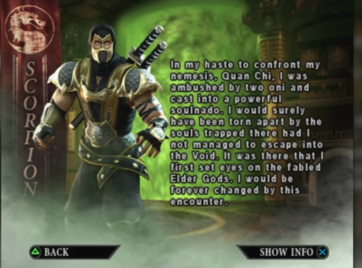 قبل بداية قصة هذا الجزء بسنوات، كان سكوربيون والذين ماتوا من محاربين الأرض في الجزء السابق تحت سيطرة سحر كوان تشي