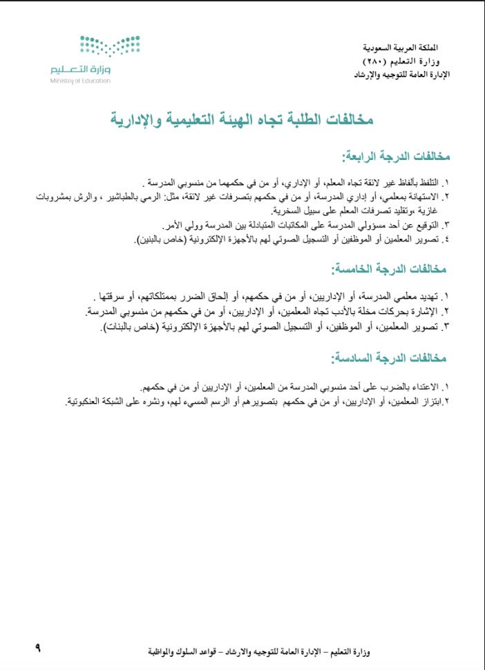 ومن هذه الاهمية اصدرت الوزارة هذا الدليل الذي يشمل بشكل عام على جميع السلوكيات والمخالفات التي يُتوقع ان تحدث للطلاب (بنين وبنات) داخل أسوار المدرسة، وأيضا يشمل الاجراءات التي يجب على منسوبي #المدرسة القيام بها.