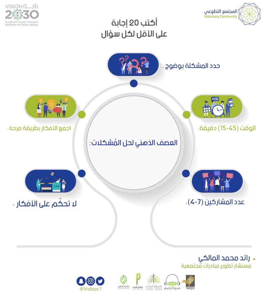 بعض المشكلات الي تواجهك في فريقك التطوعي تستطيع حلها بطريقة العصف الذهني مشاركةً مع فريق العمل، وأيضاً مناسبة في عملية تخطيط المبادرات 👍🏼.