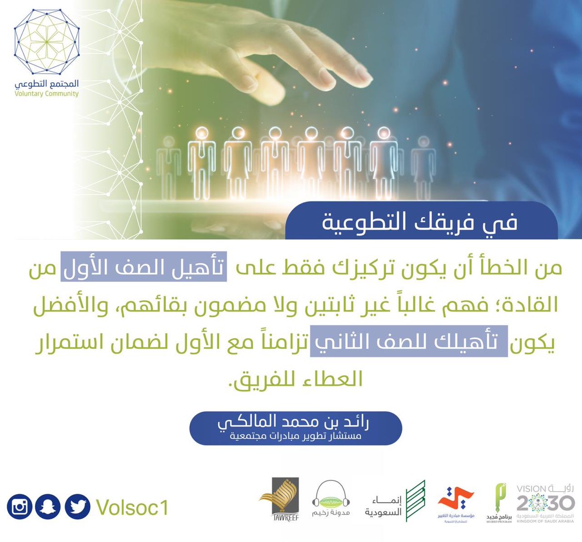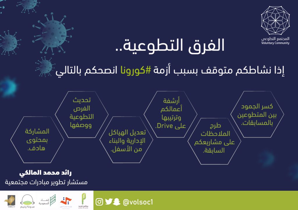 بالتعاون مع مبادرة #المجتمع_التطوعي أنتجنا محتوى بصري سأضعه تحت هذه التغريدة موجه لقادة الفرق التطوعية والمتطوعين والمنظمات غير الربحية التي تشارك المتطوعين أهدافها، أرجو أن يكون مفيداً ومرجعاً مهماً لهم (@Volsoc1).