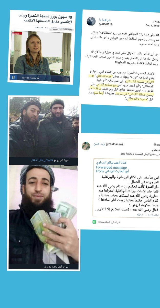 أكبر عصابة نهب أموال شهدها المحرر هي عصابة البغدادي ومن ثم عصابة الجولاني (نفط، محاصيل، مكوس، احتطاب، آثار...) وكلها بإسم الدين ونتج عنها ملايين الدولارات في كروش قادتها واملاك و عقارات ومصالح تجارية كلها على حساب الشعب المكلوم.. متبعين خطى رامي مخلوف و عائلة الأسد
