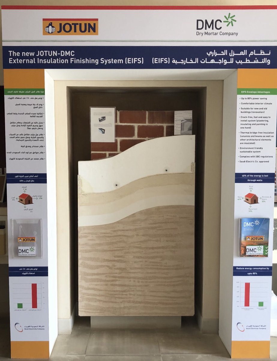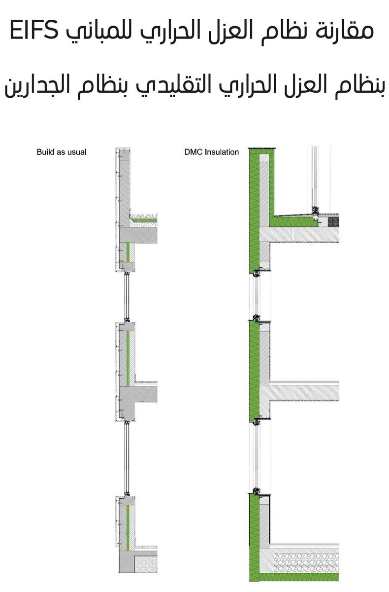 وافضل نظام يحقق هذه المتطلبات العالية من الناحية الفنية وايضا الاقتصادية هو نظام #EIFS بحيث انه يغلف المبنى بشكل كامل ويقضي على جميع الجسور والتسربات الحرارية ويعطي يوڤاليو افضل من ما هو مطلوب في كود البناء ب 0.29 عندما تكون سماكة الواح العزل ١٠سم