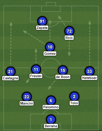 #أتالانتا يبدأ الهجوم بشكل منظم من الخلف مع الاعتماد على عمل مثلثات على الأطراف بتواجد "غوميز" لإكمال المثلث مع الظهير ولاعب الوسط، مع استمرار تدوير الكرة حتى إيجاد ثغرة لتمرير الكرة إلى منطقة الخصم، ويساندهم في ذلك تحركات "زاباتا وإليسيتش" في أنصاف المساحات (Half Spaces).