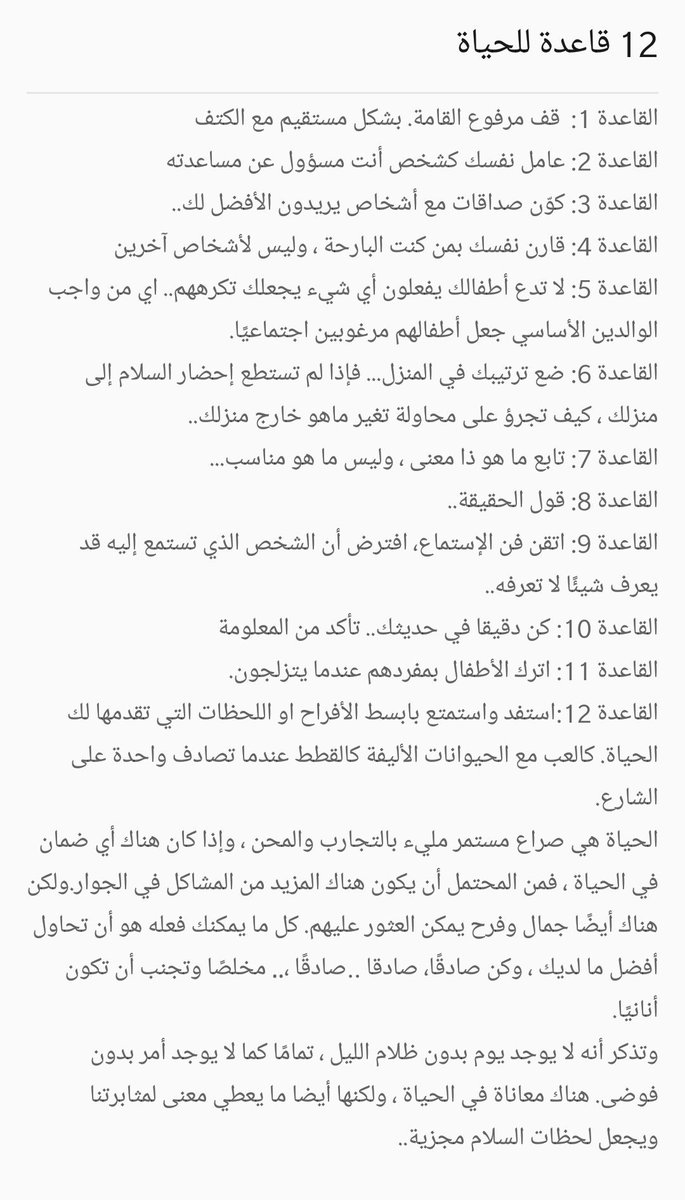 في الاعلى سلسلة تغريدات عبارة عن ملخص لكتاب ١٢ قاعدة للحياة - لعالم النفس الشهير جوردن بيترسون،
