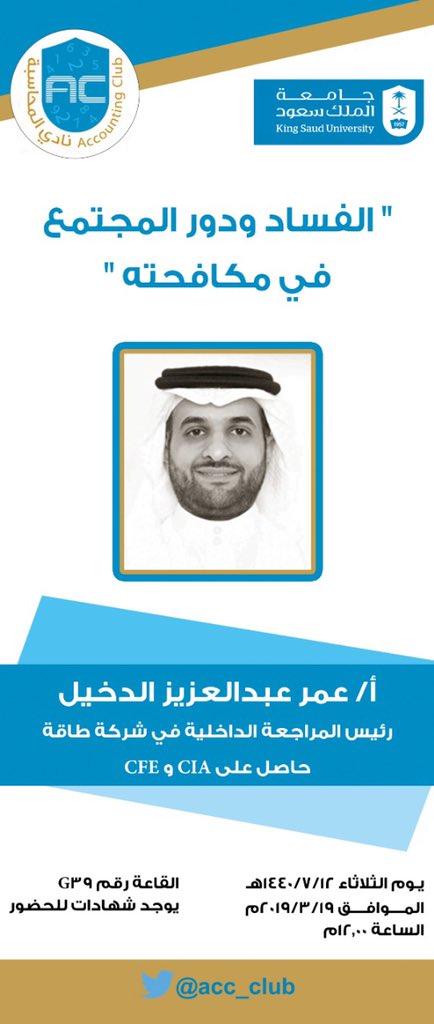 يتقدم نادي المحاسبة بالشكر للأستاذ : عمر عبدالعزيز الدخيل @omard76 رئيس المراجعة الداخلية في شركة طاقة والحاصل على شهادة CIA و CFE . على تقديمه محاضرة بعنوان "الفساد ودور المجتمع في مكافحته "