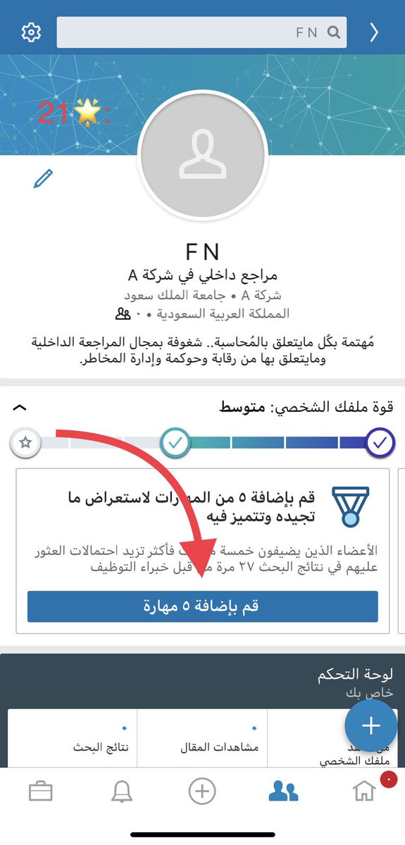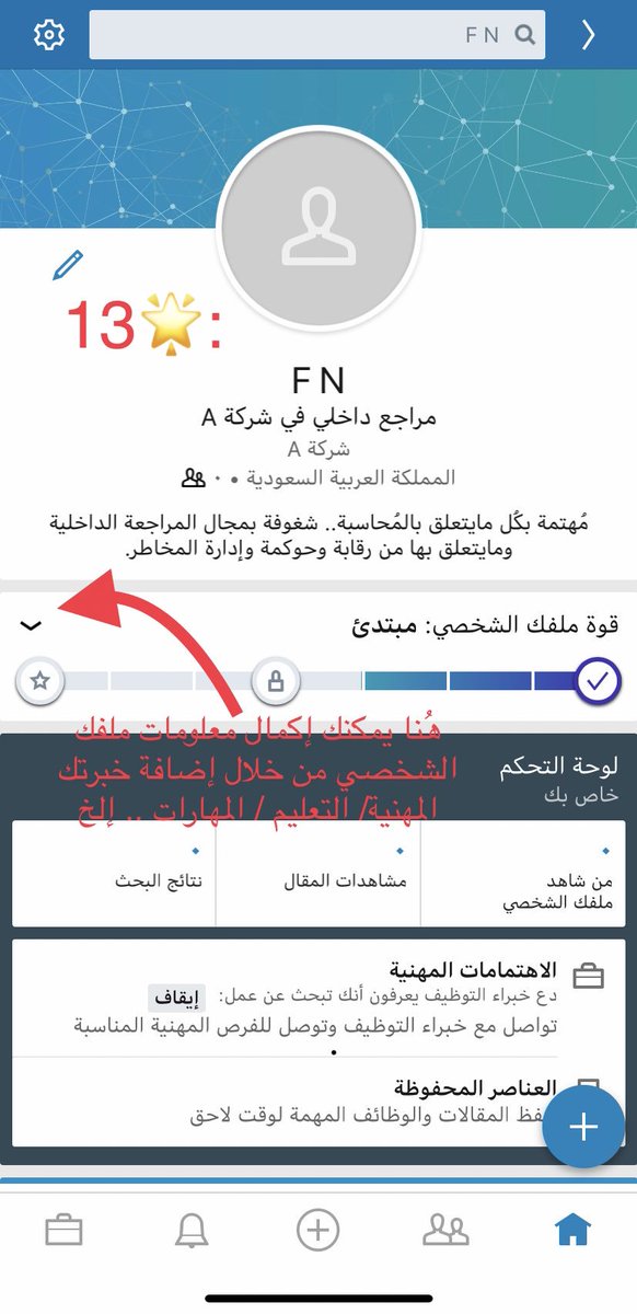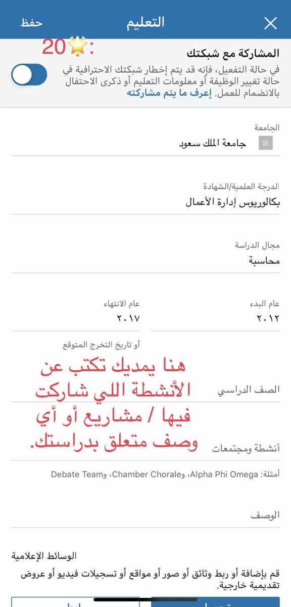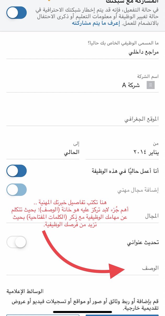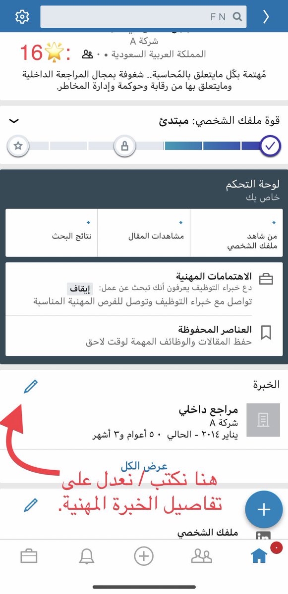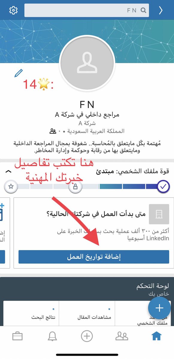 - بإمكانك مشاركة متابعينك أبرز إنجازاتك المهنية أو خبراتك المهنية معهم من خلال الكتابة بصفحتك.