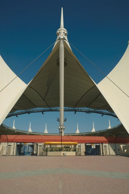 طبعا Horst Berger هو المهندس والمصمم الإنشائي الذي عمل على تطوير وتصميم وهندسة هياكل الشد خفيفة الوزن للاستاد. له أكثر من 40 مشروع بإستخدام نفس التقنية المعمارية في تغطية الفراغات.