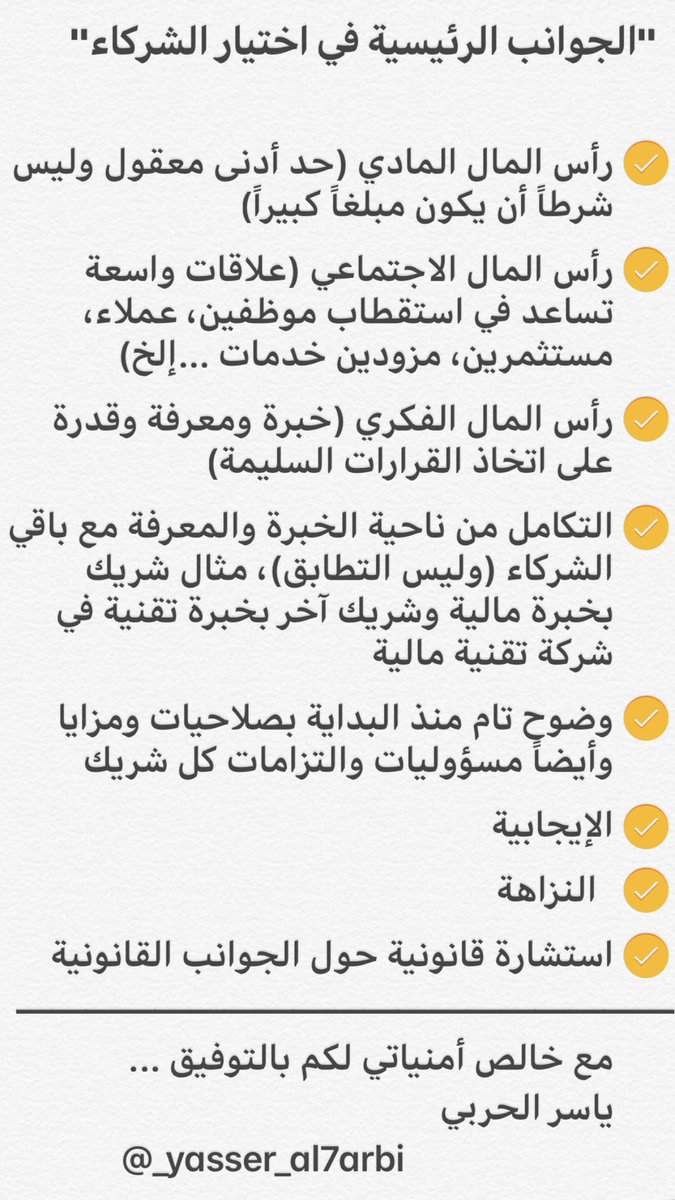 ختاماً، قد تكون هناك جوانب أخرى مهمة في الموضوع لم أتطرق لها، لكن في رأيي الشخصي أن تغطية تلك الثمان جوانب سيساعد في اتخاذ قرار جيد في موضوع الشراكة