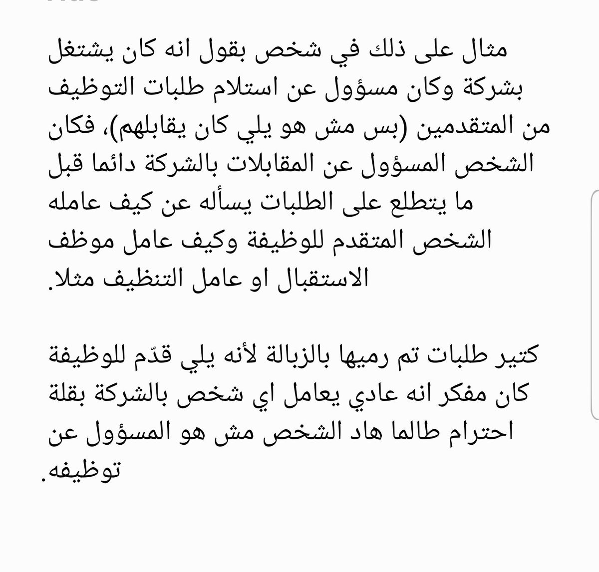 -هاي مسخرة بس ضحكتني، في واحد بقول انه بس يوصلني مجموعة طلبات تقديم للوظائف برمي نصهم بالزبالة عشان مش ناقصني اوظف ناس ما إلهم حظ ?.