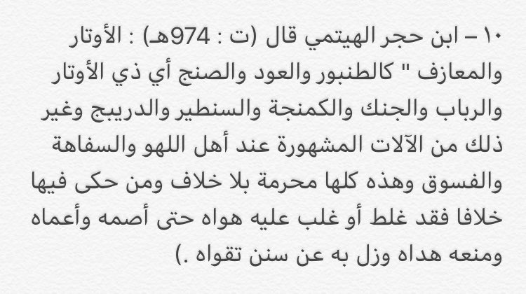 ٣- قال ابن رجب ـ من الحنابلة ـ (ت 795هـ) : وأما استماع آلات الملاهي المطربة المتلقاه من وضع الأعاجم فمحرم مجمع على تحريمه ولا يعلم عن أحد منهم الرخصة في شيء من ذلك ومن نقل الرخصة فيه عن إمام يعتد به فقد كذب وافترى )