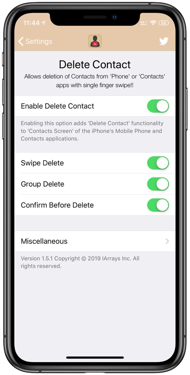 اداة Delete Contact وهي لتمكنك من حذف مجموعه من الاسماء لديك داخل الـ iOS او حذف اسم بالسحب من اليسار لليمين ( في سورس بيق بوس )