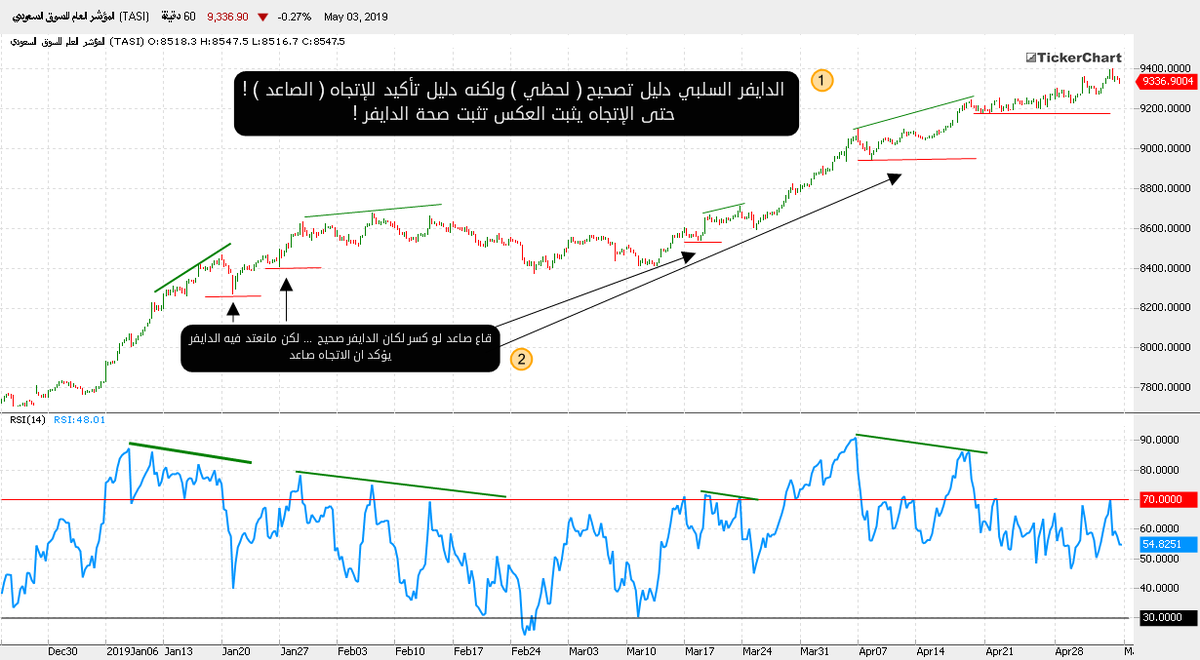 تخيل السعر في اتجاه هابط لمدة طويلة و ال RSI نفس الكلام هابط معه و مثلاً كان عند مستوى 20 ، بعدين بدأ السعر يرتفع في هالحالة ال RSI يرتفع معه كان عند مستوى 20 الان بدأ يطلع الى مستوى 40