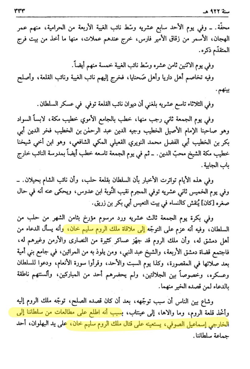 ابن طولون يذكر ان السلطان سليم مَلَك حَلَب بأمان من أهلها ، وأحسن إلى فقهائها وفقرائها ودخل تحت طاعته نائب حلب خيري بك فأكرمه !