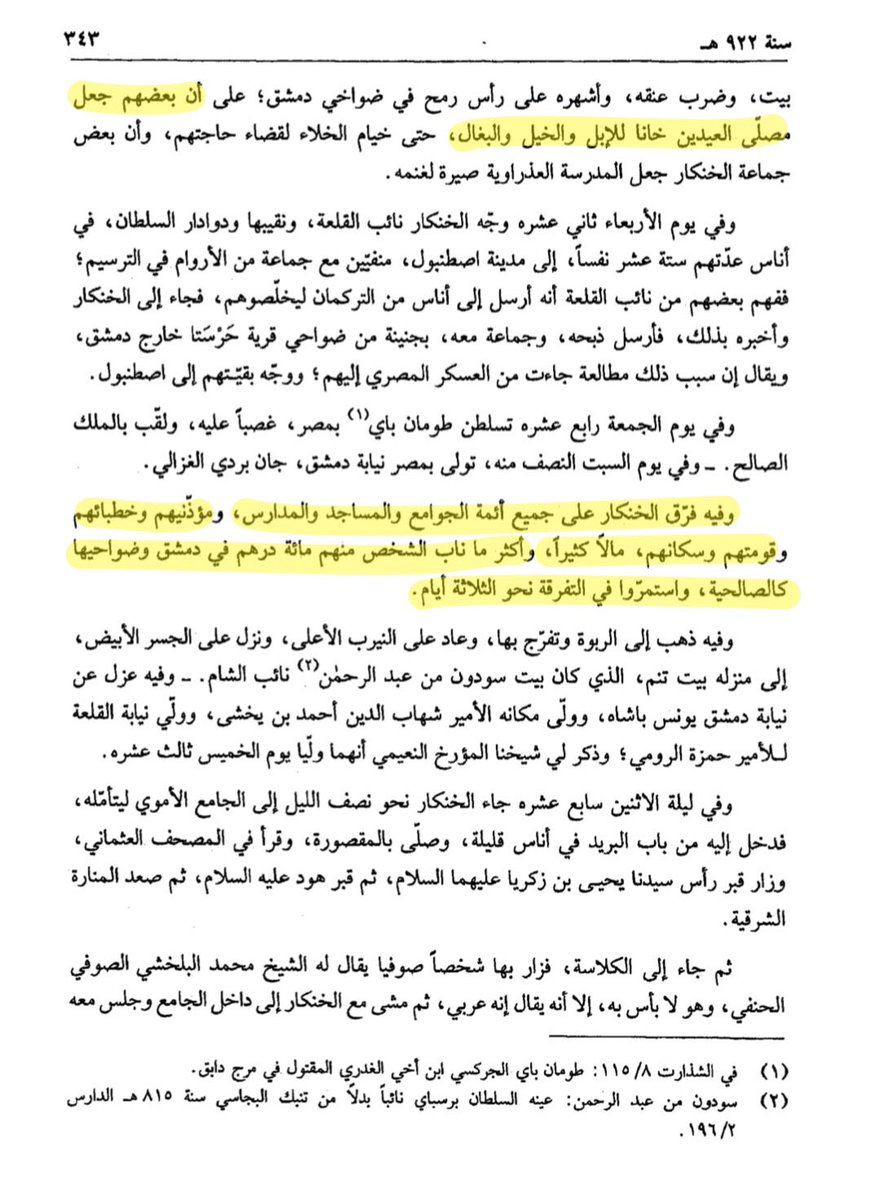 نعم المؤلف ذكر ان بعض العساكر جعل مصلى العيد خاناً للإبل والخيل .. ولكن ، لماذا لا تذكر ايضاً أن السلطان فرّق على "جميع" أئمة الجوامع والمدارس مالاً كثيراً ؟