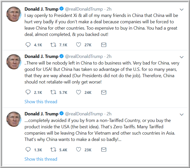 @realDonaldTrump كما سبق أن ذكرنا في هذا الموضوع ، ان الرئيس ترامب يلعب بالنار وهو بالضبط كمن يطلق النار على قدمية .. الصين بدأت تستخدم سلاح العملة ، والتضخم في أمريكا بدأ بالارتفاع وهو ما اظهرته البيانات الاقتصادية الامريكية مؤخراً ، وستصبح خيارات الفدرالي الأمريكي صعبه للغاية ..