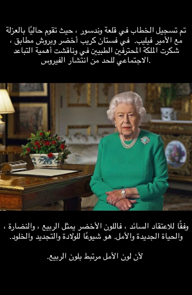 ليش أختارت الملكة اللون الأخضر والبروش الفيروزي في خطابها الأخير و هي بالحجر الصحي ؟