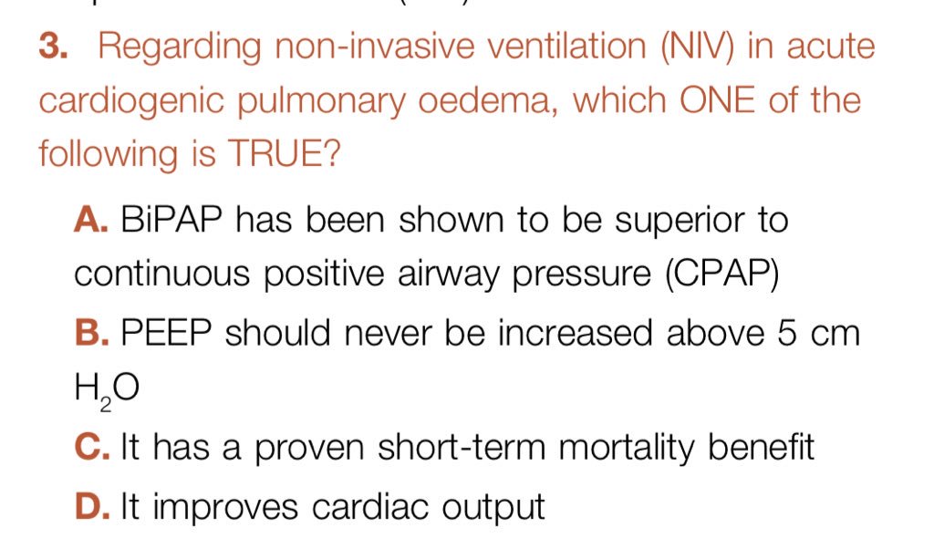 There is high-quality evidence that NIV decreases the need for intubation and induces a more rapid improvement in respiratory distress and metabolic disturbance than does standard oxygen therapy in patients with acute cardiogenic pulmonary oedema
