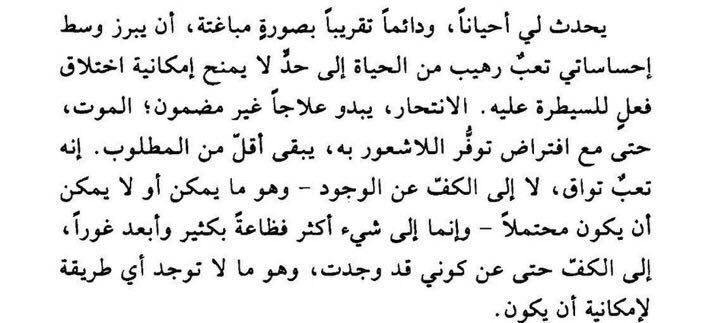 وصلت الى مرحلة الشبع من العدم ، إلى الامتلاء من اللاشيء المطلق . وهذا ما يدفعني إلى الانتحار ، ولن يزد الأمر -عندها- عن وخز شبيه بذاك الذي يدفعنا للاستيقاظ مبكرًا ..