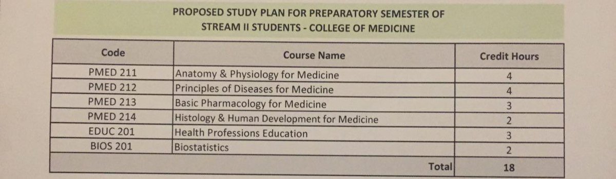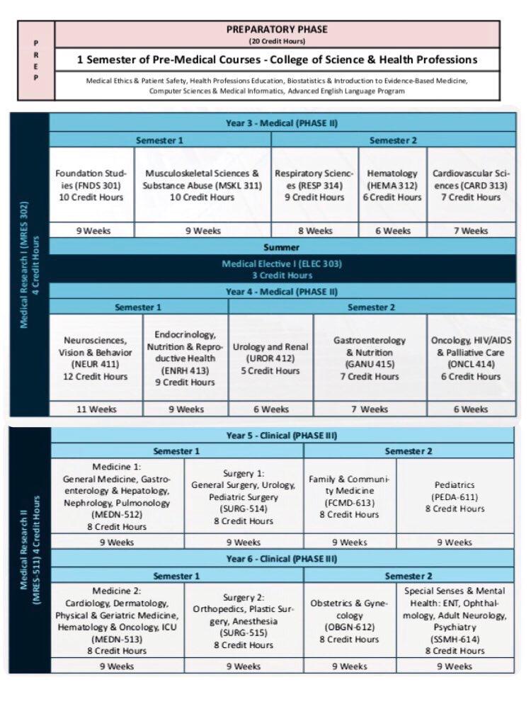 الخطة الدراسية عبارة عن: -ترم تحضيري، -سنتين دراسية للعلوم الأساسية الطبية، -سنتين دراسية إكلينيكية، وأخيراً سنة الإمتياز.