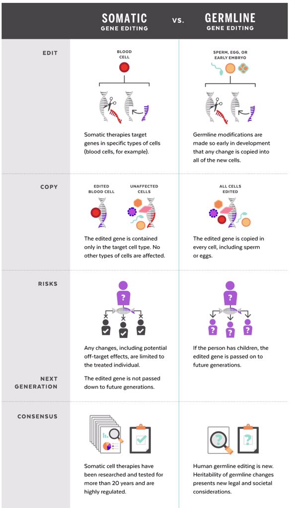 فهو يغير جينوم الجينين البشري في مراحله الاولى ، فهو يؤثر ع كل خليه. مما يعني لا يؤثر فقط ع الشخص المريض فقط وانما ع نسله ومن هنا نبعت المخاوف في استخدام تقنيات الكريسبر ع هذا النوع من التعديل.