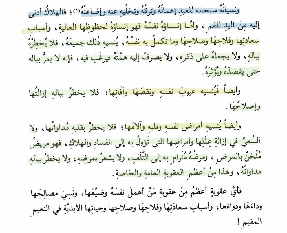"فلمَّا نسوا ربَّهم سبحانه نسيَهُم وأنساهم أنفسهم، كما قال الله تعالى: ﴿نَسُوا اللَّهَ فَنَسِيَهُم﴾ التوبة: ٦٧