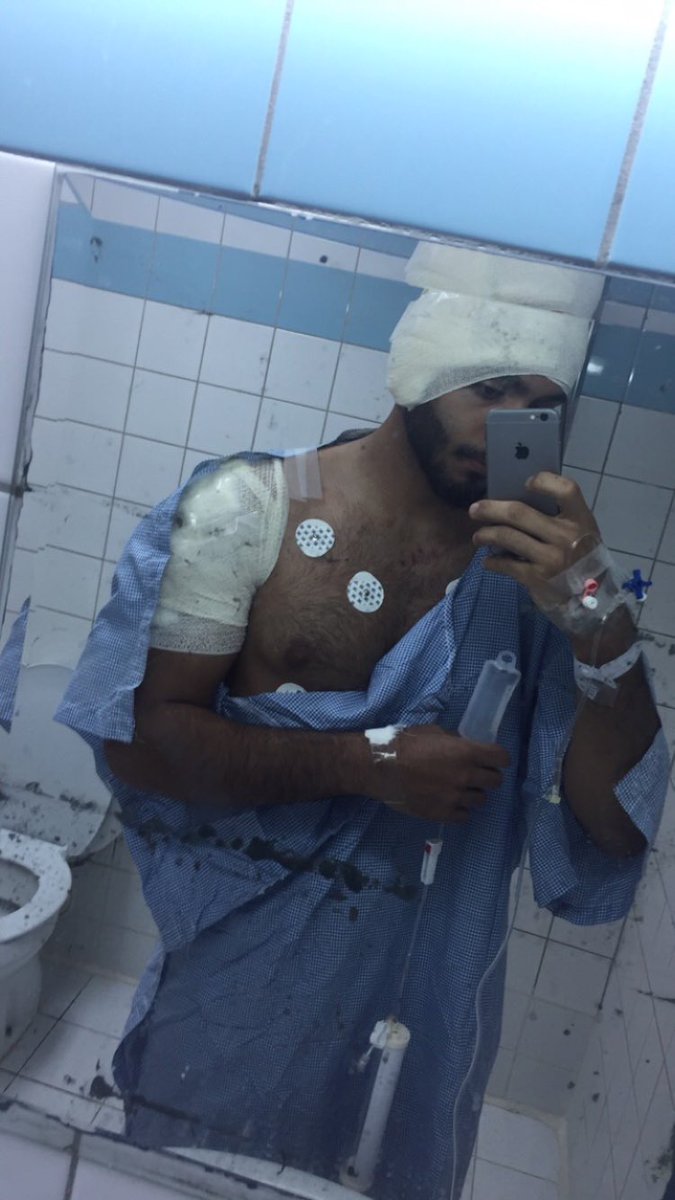 أتاني رجل لم اره من قبل مصري الجنسية نظر الي وقال"حضرتك كويس"، اعتدت على ان اجاوب بقناعة لذا فتحت هاتفي لأرى وجهي الذي كان مغطى بالدماء، وتحديدا اذني التي لم تبدو على ما يرام على الاطلاق كانت معلقة بقطعة جلد.
