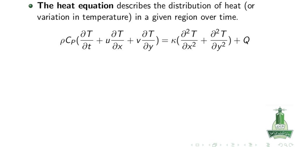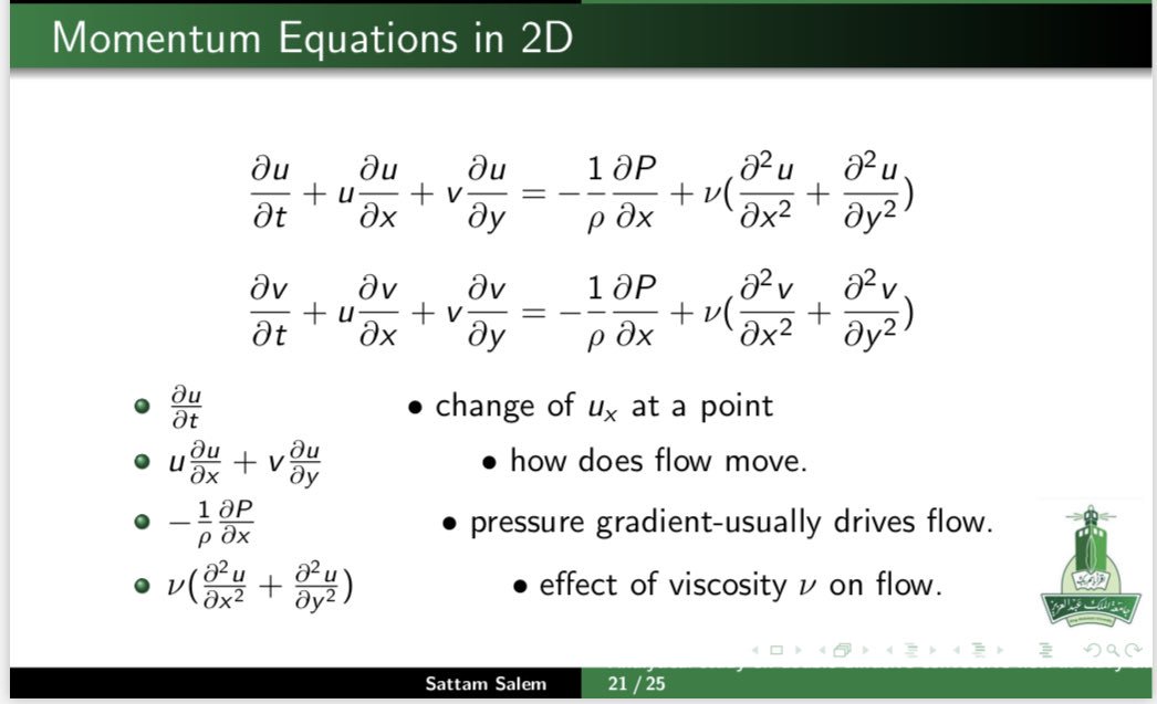 🔸المعادلات الاساسية في وصف حركة الموائع وانتقال الحرارة تتكون من معادلة الاستمرارية (حفظ الكتلة) Continuity eq ومعادلات الحركة (معادلات نافيير ستوكس ) momentum eqs ومعادلة حفظ الطاقة.