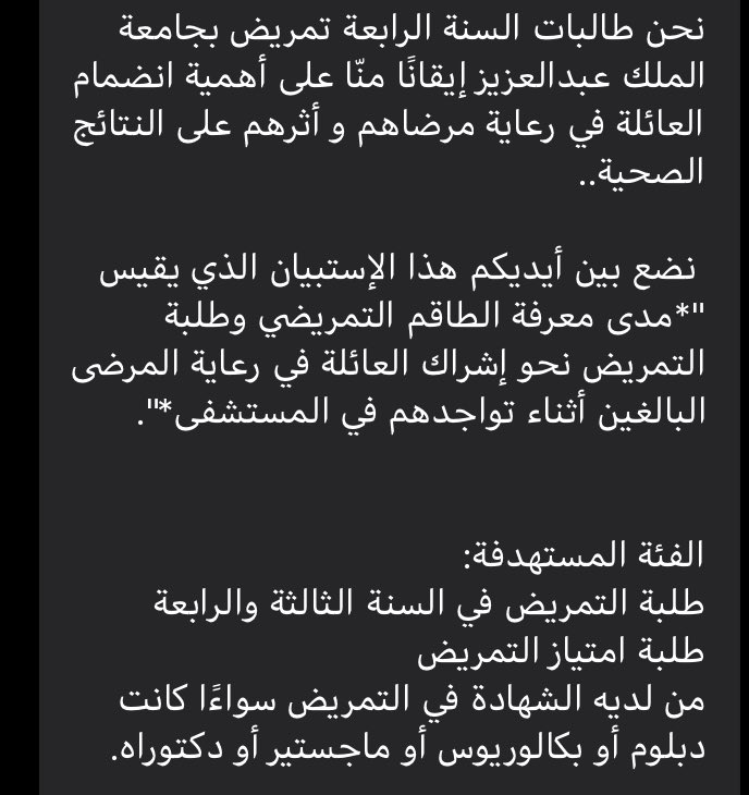 انا طالب ماجستير، يسعدني مشاركتكم في استبيان البحث التالي، المده المتوقعه من ٢ الى ٣ دقائق الفئه طلاب وطالبات التمريض.