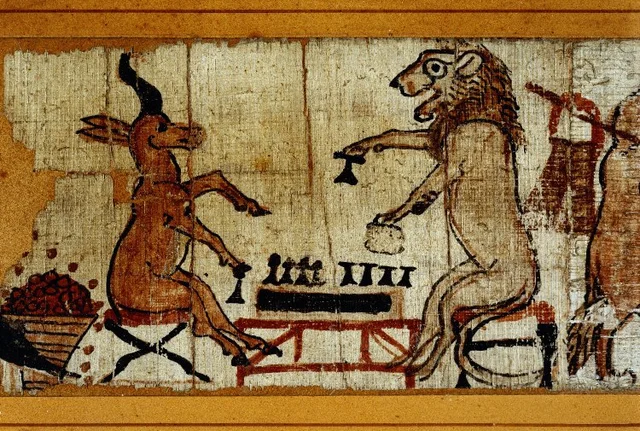 في الجزء الأيسر من البردية يقوم أسد بلعب لعبة السينيت المصرية مع غزال.