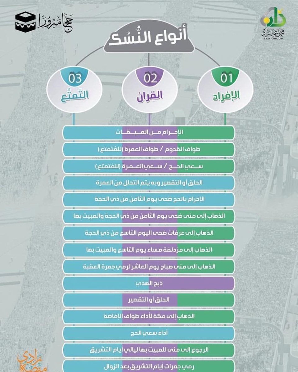 وأمّا القِران فهو: أن يُحرم بالحج والعمرة معًا، وتندرج أعمال العمرة في الحج.