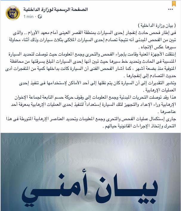 هذا وقد توصلت التحريات المبدئية وجمع المعلومات إلى وقوف حركة حسم التابعة لجماعة الإخوان الإرهابية وراء الإعداد والتجهيز لتلك السيارة إستعداداً لتنفيذ إحدى العمليات الإرهابية بمعرفة أحد عناصرها #بيان_وزارة_الداخلية #معهد_اِلاورام #المنيل