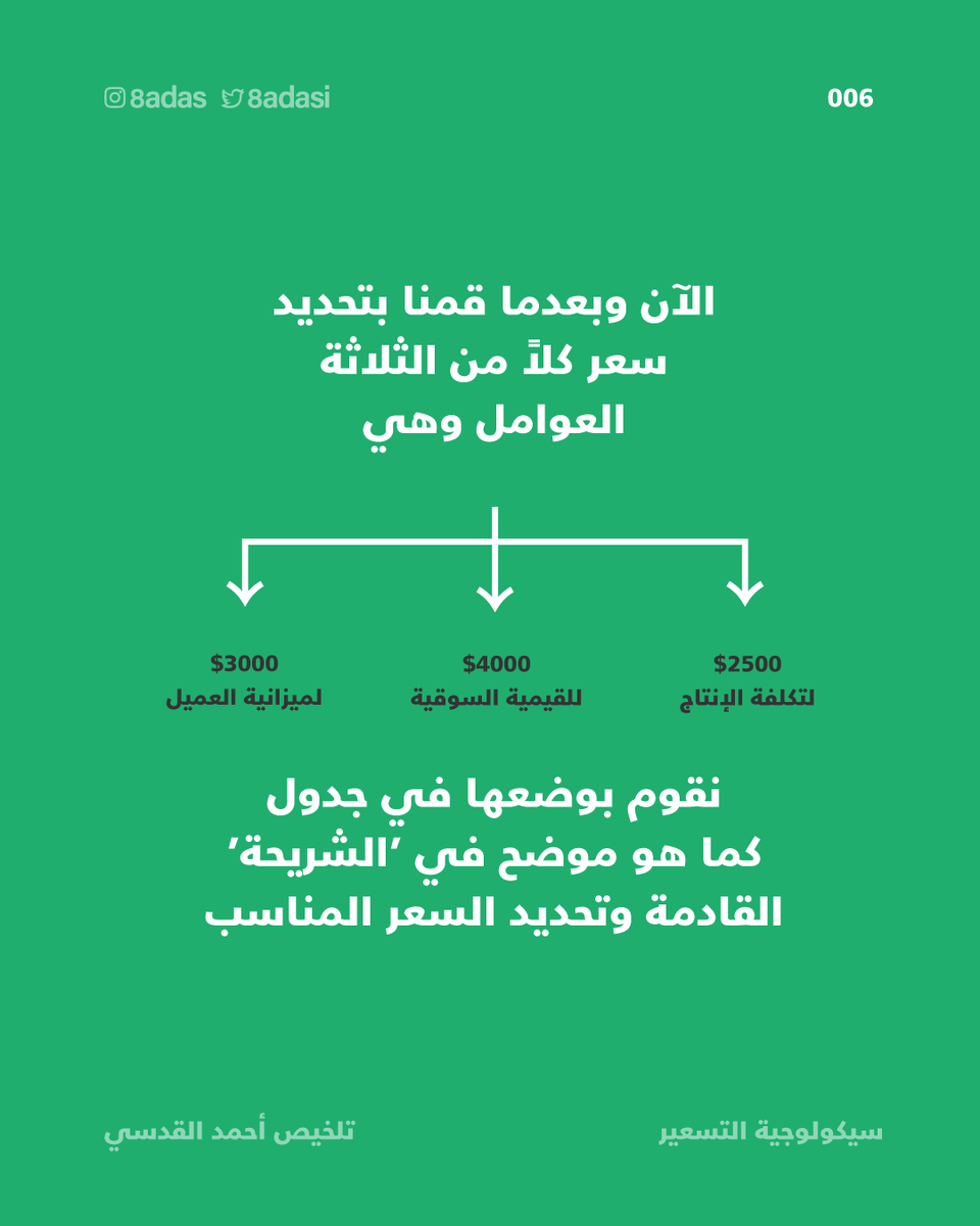 ثاني عامل في #سيكولوجية_التسعير ويعتمد على أربع ركائز أساسية بحيث يخرج المصمم منها - بعد دراستها- بسعر أدني وسعر أعلى واللتي سيستفيد منها في المرحلة قبل الأخيرة (007)