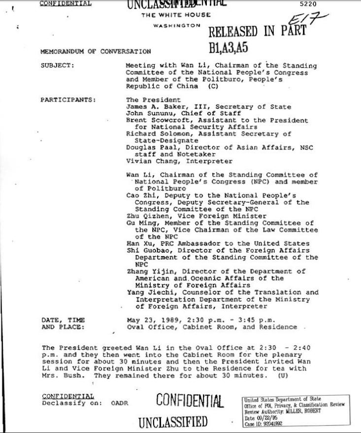 يانگ جيإتشي، مدير الشئون الخارجية في الحزب الشيوعي الصيني، سبق له من 30سنة، القيام بزيارة سرية للبيت الأبيض في مارس 1989، عند احتدام مظاهرات تيان آن من. وبعد الزيارة مباشرة، قامت الصين بسحق المظاهرة في ساعتين. أميط اللثام جزئيا عن مذكرة البيت الأبيض.