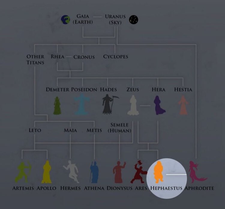 كانت هيرا، والدة هيفايستوس، تهلع من عيوبه، فطردته من جبل أوليمبس باشمئزاز. حيث قامت حورية البحر ثيتيس بالاعتناء بالطفل الإله.