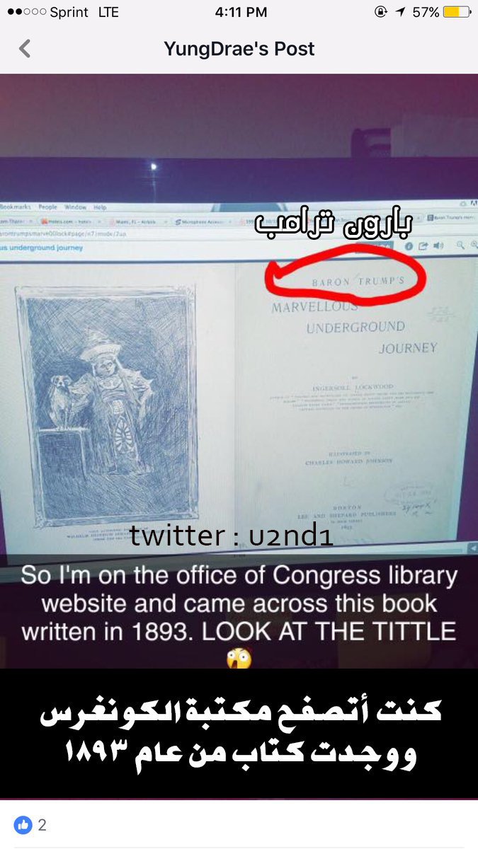 دخلت موقع مكتبة الكونغرس الإلكتروني وحصلت كتاب من عام 1893 عنوانه اسم (بارون ترامب) وقصة الكتاب تقول فيه ولد اسمه بارون ترامب أكتشف معبر سري يقدر يخليه يتنقل عبر الماضي والمستقبل.