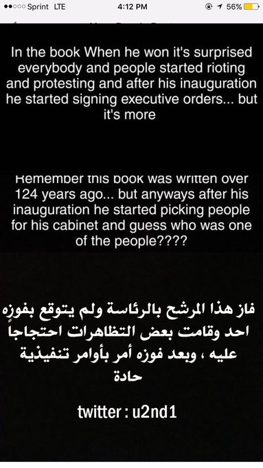 @u2nd1 قصة هذا الكتاب كانت تقول بإنه في شخص غني جداً رشح نفسه للرئاسة وهذا الشخص كان يعيش في نيويورك وتحديداً الاب نيو الخامس وهذا نفس عنوان "برج ترامب تاور" في نيويورك وفاز بالرئاسة ومحد كان متوقع انه يفوز .. وبعد فوزه أحتجوا الناس وخرجوا للتظاهر والإعتصامات.